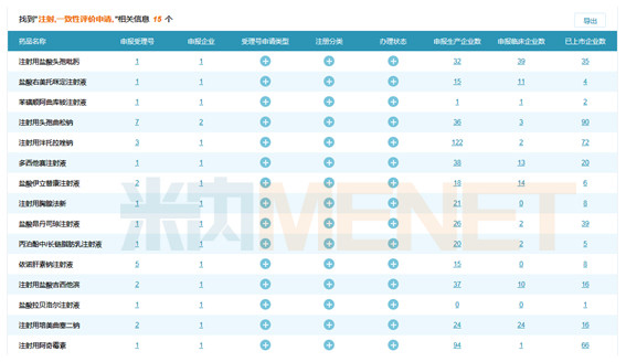 據米內網(wǎng)MED中國藥品審評數據庫2.0數據,截至目前,除了已經(jīng)通過(guò)一致性評價(jià)的注射用阿奇霉素,國家藥監局還接收到化藥注射劑一致性評價(jià)申報29個(gè),涉及14個(gè)品種、10家企業(yè)。