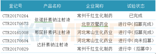 截至目前,一致性評價(jià)中準備開(kāi)展/已開(kāi)展/已完成BE試驗的注射劑有5個(gè)登記號,涉及企業(yè)3家,品種3個(gè)。從進(jìn)行試驗的企業(yè)看,常州千紅生化藥業(yè)、河北常山生化藥業(yè)均有2個(gè)產(chǎn)品處于試驗階段;從試驗的產(chǎn)品看,有2家藥企進(jìn)行BE試驗的依諾肝素鈉注射液,深圳市天道醫藥已搶先一步,其產(chǎn)品已經(jīng)處于申報一致性評價(jià)的隊列。