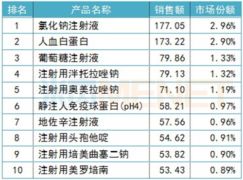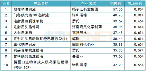 2018年中國公立醫療機構終端化藥注射劑產(chǎn)品TOP10(單位:億元)