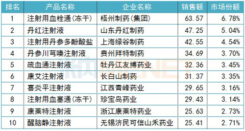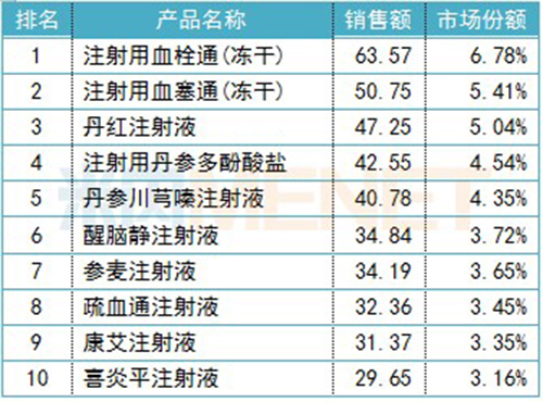品牌TOP10銷(xiāo)售額均超過(guò)25億元,其中,梧州制藥(集團)的注射用血栓通(凍干)、山東丹紅制藥的丹紅注射液等7個(gè)是獨家品種。