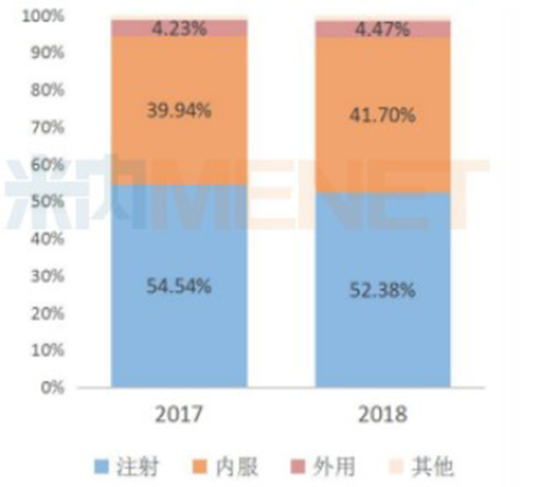 米內網(wǎng)數據顯示,2018年在中國城市公立醫院、縣級公立醫院、城市社區中心及鄉鎮衛生院(簡(jiǎn)稱(chēng)中國公立醫療機構)化學(xué)藥和中成藥的注射劑合計銷(xiāo)售額達6920億元,注射劑占中國公立醫療機構的比例較大,但近年來(lái)其市場(chǎng)份額呈下滑趨勢,口服制劑則穩步增長(cháng)。