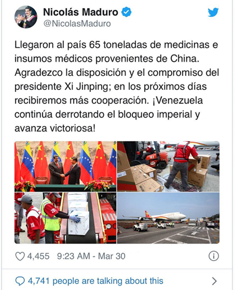 3月30日,中國政府向拉美地區派出的第一個(gè)醫療專(zhuān)家組到達委內瑞拉,并帶來(lái)了第二批抗疫物資。