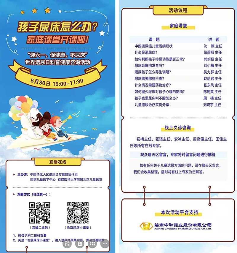 2021年5月30日,恰逢世界遺尿日和六一兒童節來(lái)臨之際,來(lái)自中國醫師協(xié)會(huì )兒腎醫師分會(huì )華北大區遺尿管理協(xié)作組的17位兒科專(zhuān)家,共同舉辦了“迎六一,促健康,不尿床”主題的世界遺尿日科普健康咨詢(xún)活動(dòng)。專(zhuān)家們針對尿床患兒家長(cháng)最關(guān)心的問(wèn)題進(jìn)行了線(xiàn)上講座答疑和義診咨詢(xún),本次活動(dòng)以網(wǎng)絡(luò )直播的方式呈現,旨在提高兒童夜遺尿的疾病認知度,呼吁公眾關(guān)注有夜遺尿的兒童,讓他們回歸天真爛漫健康的童年,吸引了900余位患兒家長(cháng)上線(xiàn)參與互動(dòng)。