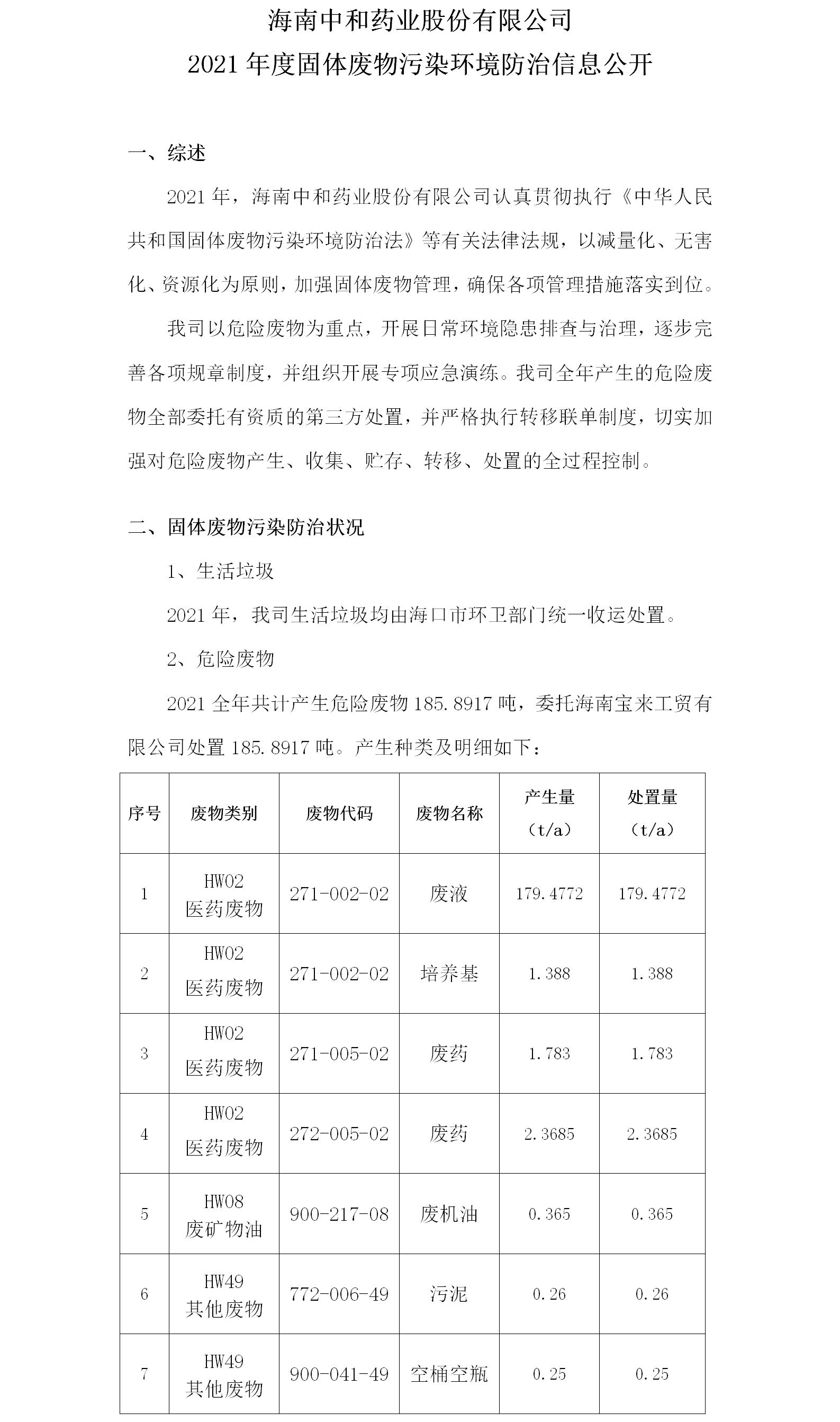 海南中和藥業(yè)股份有限公司2021年度固體廢物污染環(huán)境防治信息公開(kāi)