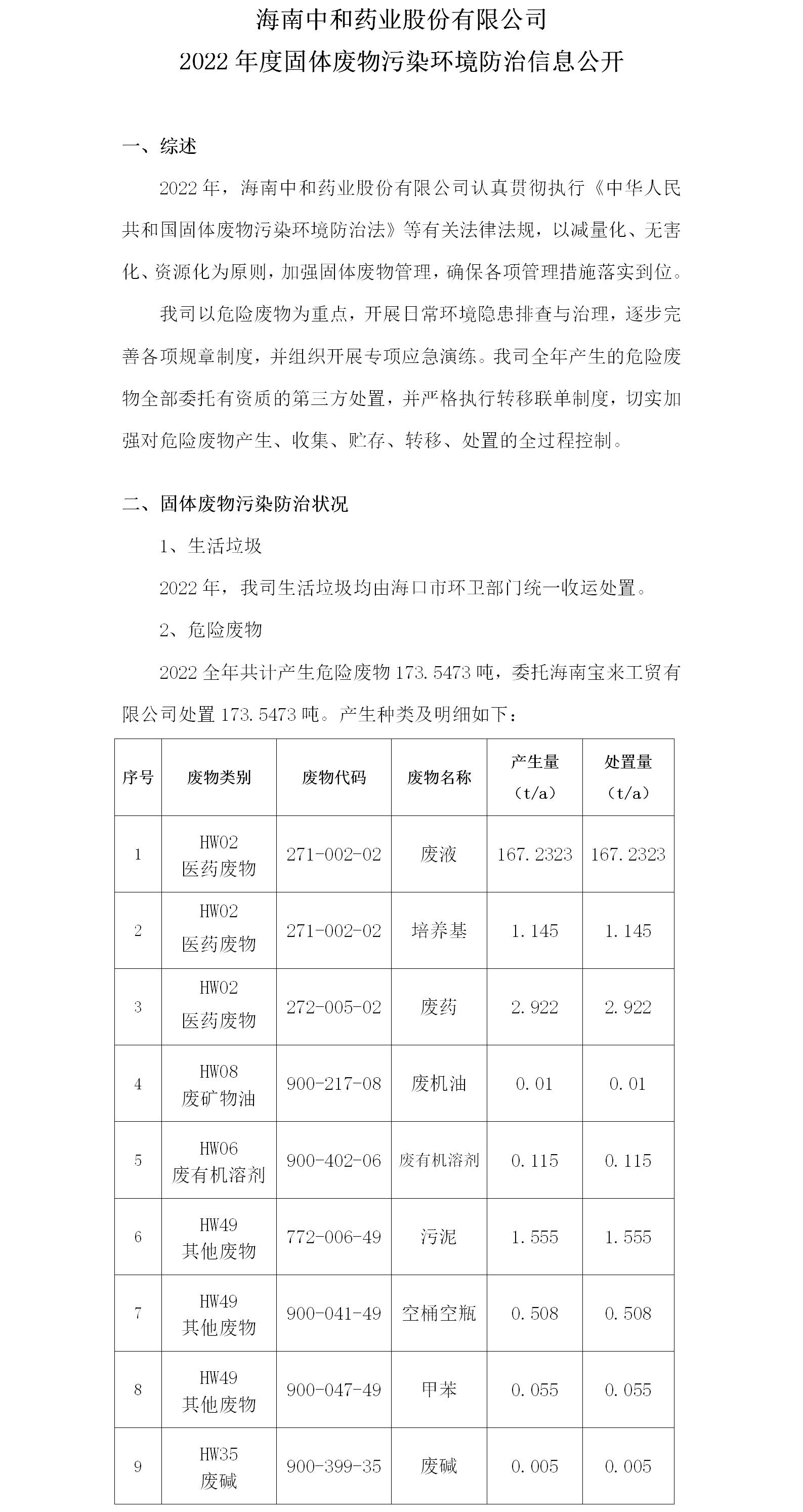 海南中和藥業(yè)股份有限公司2022年度固體廢物污染環(huán)境防治信息公開(kāi)