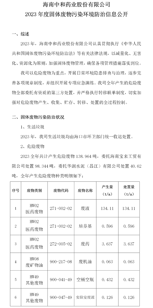 海南中和藥業(yè)股份有限公司固體廢物污染環(huán)境防治信息公開(kāi)(2023年度)