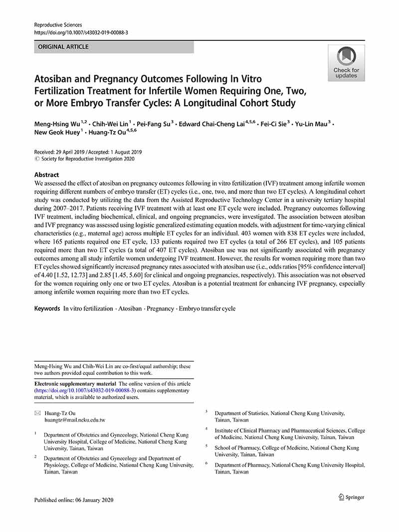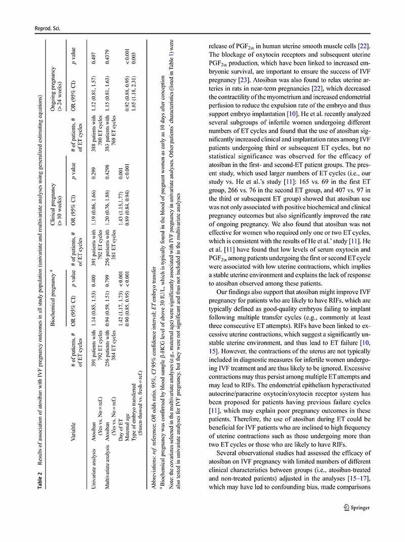 結論:注射阿托西班是一種潛在的提高體外受精妊娠率的治療方法,特別是在需要兩個(gè)以上胚胎移植周期的不孕婦女中。
