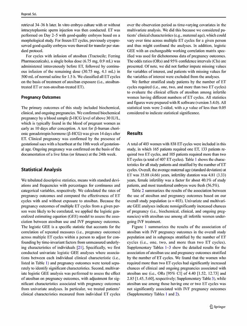 方法:利用2007-2017年某大學(xué)三級醫院輔助生殖技術(shù)中心的數據進(jìn)行了一項縱向隊列研究。納入標準為至少接受一個(gè)胚胎移植周期的體外受精治療的患者。研究體外受精治療后的妊娠結局,包括生化、臨床和持續妊娠。使用logistic廣義估計方程模型評估阿托西班和體外受精之間的相關(guān)性,并校正個(gè)體多個(gè)ET周期中隨時(shí)間變化的臨床特征(如母親年齡)進(jìn)行調整。共納入403例女性, 838個(gè)胚胎移植周期,其中165例患者接受一個(gè)胚胎移植周期,133例接受兩個(gè)胚胎移植周期(即266個(gè)胚胎移植周期),105例接受兩個(gè)以上胚胎周期(共407個(gè)胚胎移植周期)。