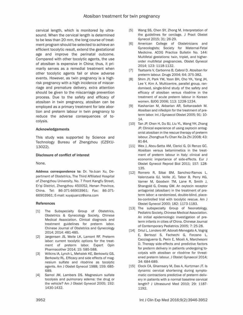 結論:阿托西班可有效延長(cháng)晚期流產(chǎn)以及早產(chǎn)的雙胎妊娠的妊娠時(shí)間。對于宮頸長(cháng)度<20mm的病例,長(cháng)療程治療更有效,效果更好。長(cháng)期治療不會(huì )增加母嬰的不良反應。