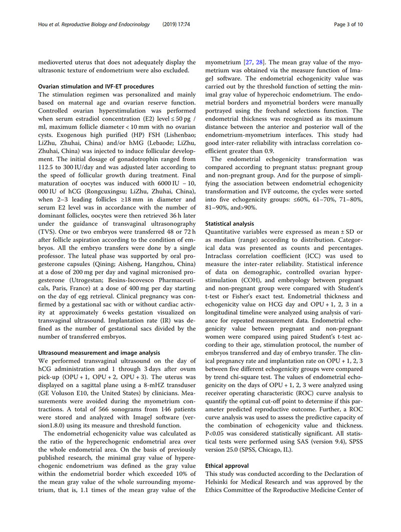 背景:非侵入性測量子宮內膜容受性的方法很有價(jià)值,因為它有可能改善體外受精(IVF)結局。有人認為hCG給藥當天的子宮內膜回聲是子宮內膜容受性的良好標志。在日常實(shí)踐中,我們注意到胚胎移植日子宮內膜非均質(zhì)高回聲的患者通常妊娠率較低。因此,我們將延伸擴展了hCG觸發(fā)后子宮內膜回聲模式轉化的研究,以分析子宮內膜回聲改變與IVF結局之間的關(guān)系。