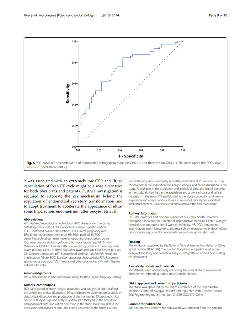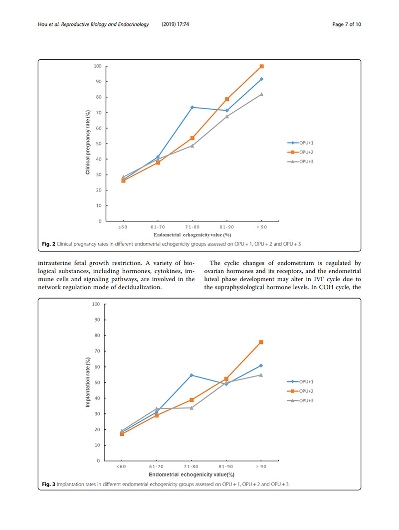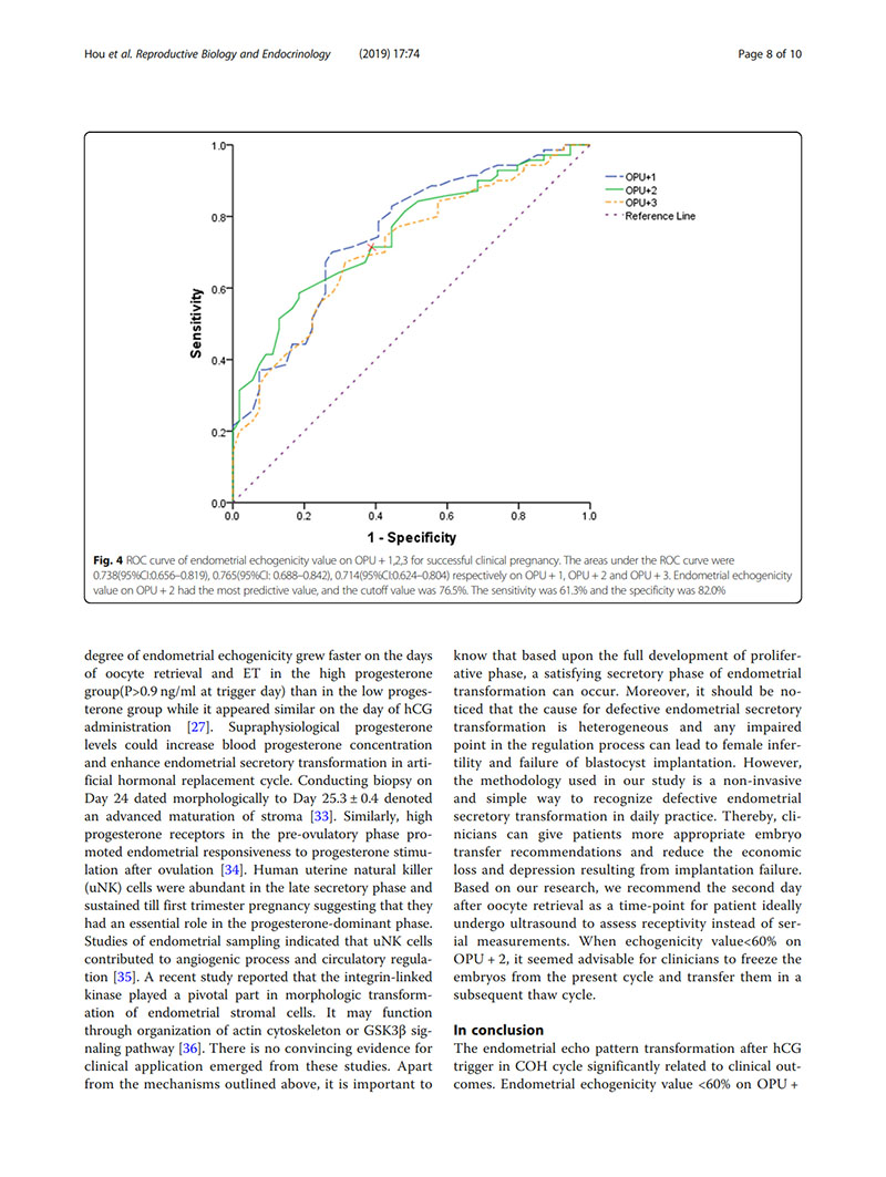結論:建議用取卵后第2天(OPU+2)的子宮內膜回聲值評價(jià)子宮內膜容受性。當OPU+2的回聲值<60%時(shí),臨床醫生似乎適合提供“全冷凍”IVF周期,并在隨后的凍融胚胎周期中進(jìn)行移植。